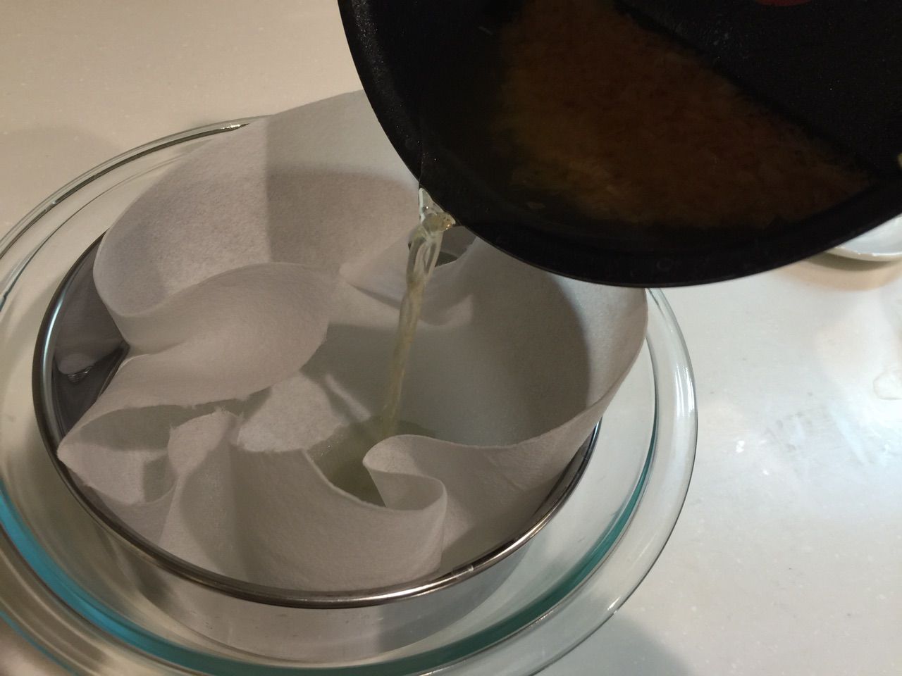 6.鰹節が下に沈んで、粗熱をとったら、ザルにクッキングペーパーを敷いてこす