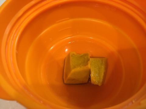 1、かぼちゃを3cm角ぐらいに切って、大さじ1の水を加えて蓋をする